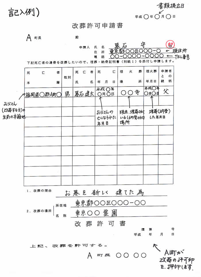 各市役所(自治体)の改葬許可申請書 の記入例
